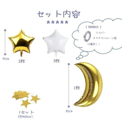 セット内容膨らます前の平置き(cm)月(ゴールド)1枚 約 85cm星(ゴールド)2枚 約 45cm星(ホワイト)3枚 約 45cmグリッター付きガーランド【 期間限定 】シルバーキラキラバルーン紐注意事項海外製 ヘリウムガスは入っていません。