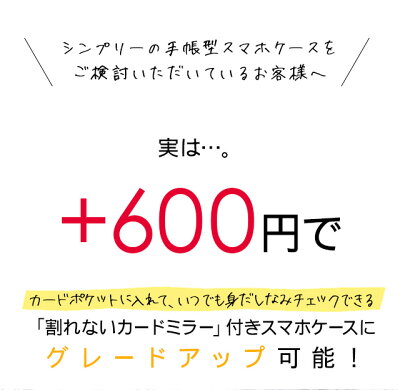 +600円でミラー付きスマホケースにグレードアップ!カードポケットにすっぽり収まる「カード型ミラー」を一緒にお届けします。